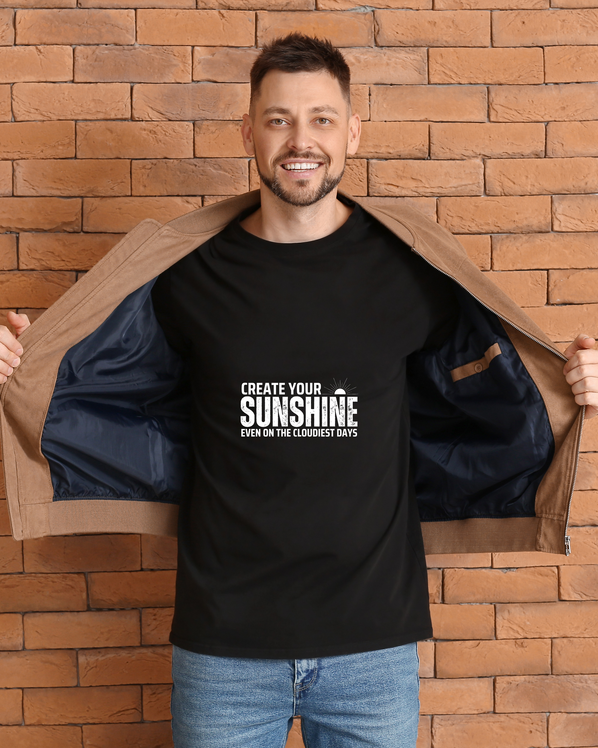 Shine brighter no matter the forecast with the "CREATE YOUR SUNSHINE EVEN ON THE CLOUDIEST DAYS" cotton t-shirt — a feel-good, wear-everywhere piece made for those who choose joy, optimism, and good energy no matter what life throws their way.